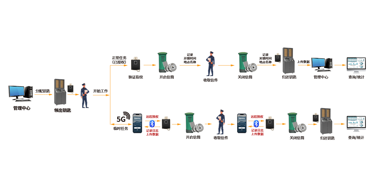 ? 歸庫上傳:完成全部信筒收取任務,郵遞員返回郵電所,將電子鑰匙插入智能鑰匙柜對應倉位,倉位觸點瞬間連接,鑰匙內置數據經柜子 4G/5G 模塊實時、高速上傳至系統管理軟件;系統接收數據后,自動比對任務計劃,精準核算郵遞員工作效率、信件收取量,生成詳盡績效報告;同時,鑰匙柜開啟充電程序,為下次出勤蓄能。